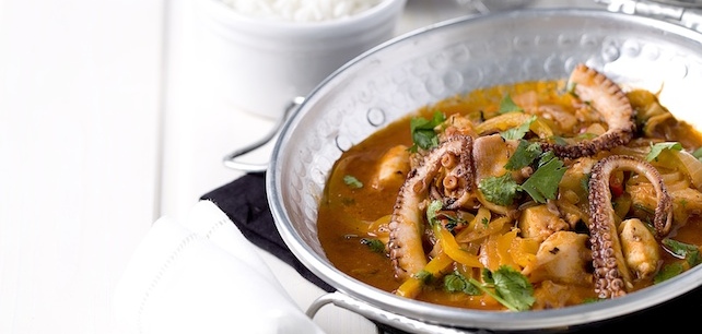 Acompanhe com arroz branco basmati e decore com as restantes folhas de coentros.